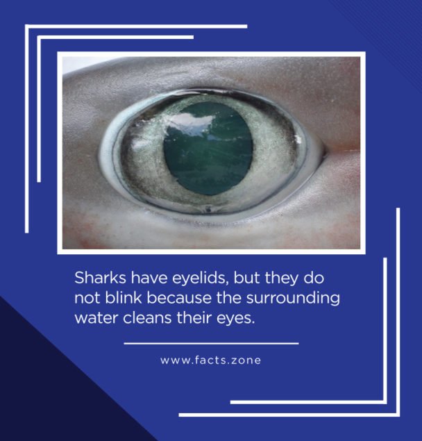 Sharks have eyelids, but they do not blink because the surrounding water cleans their eyes