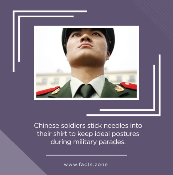 Chinese soldiers stick needles into their shirt to keep ideal postures during military parades