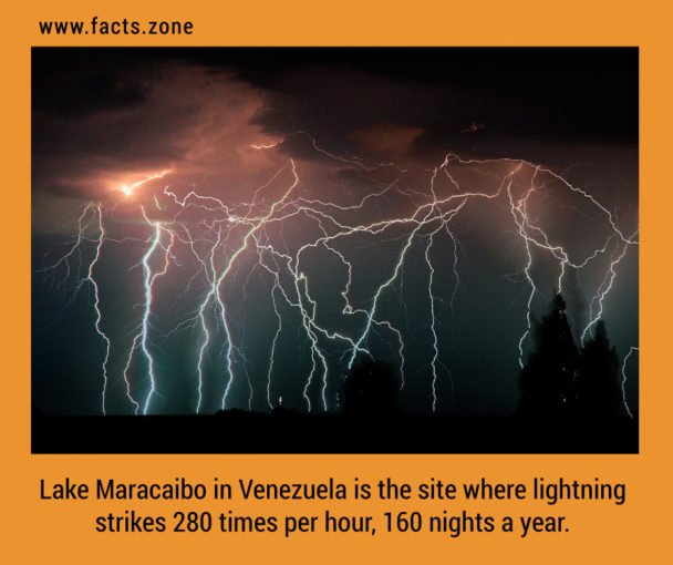Lake Maracaibo in Venezuela is the site where lightning strikes 280 times per hour, 160 nights a year.