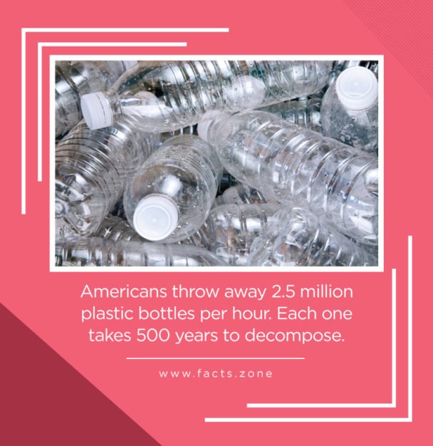 Americans throw away 2.5 million plastic bottles per hour. Each one takes 500 years to decompose