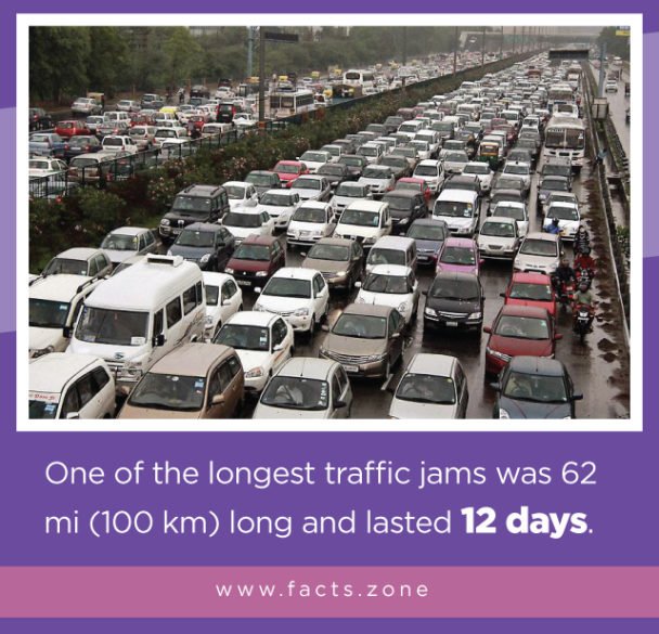 One of the longest traffic jams was 62 mi (100 km) long and lasted 12 days