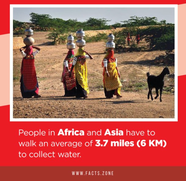 People in Africa and Asia have to walk an average of 3.7 miles (6 KM) to collect water